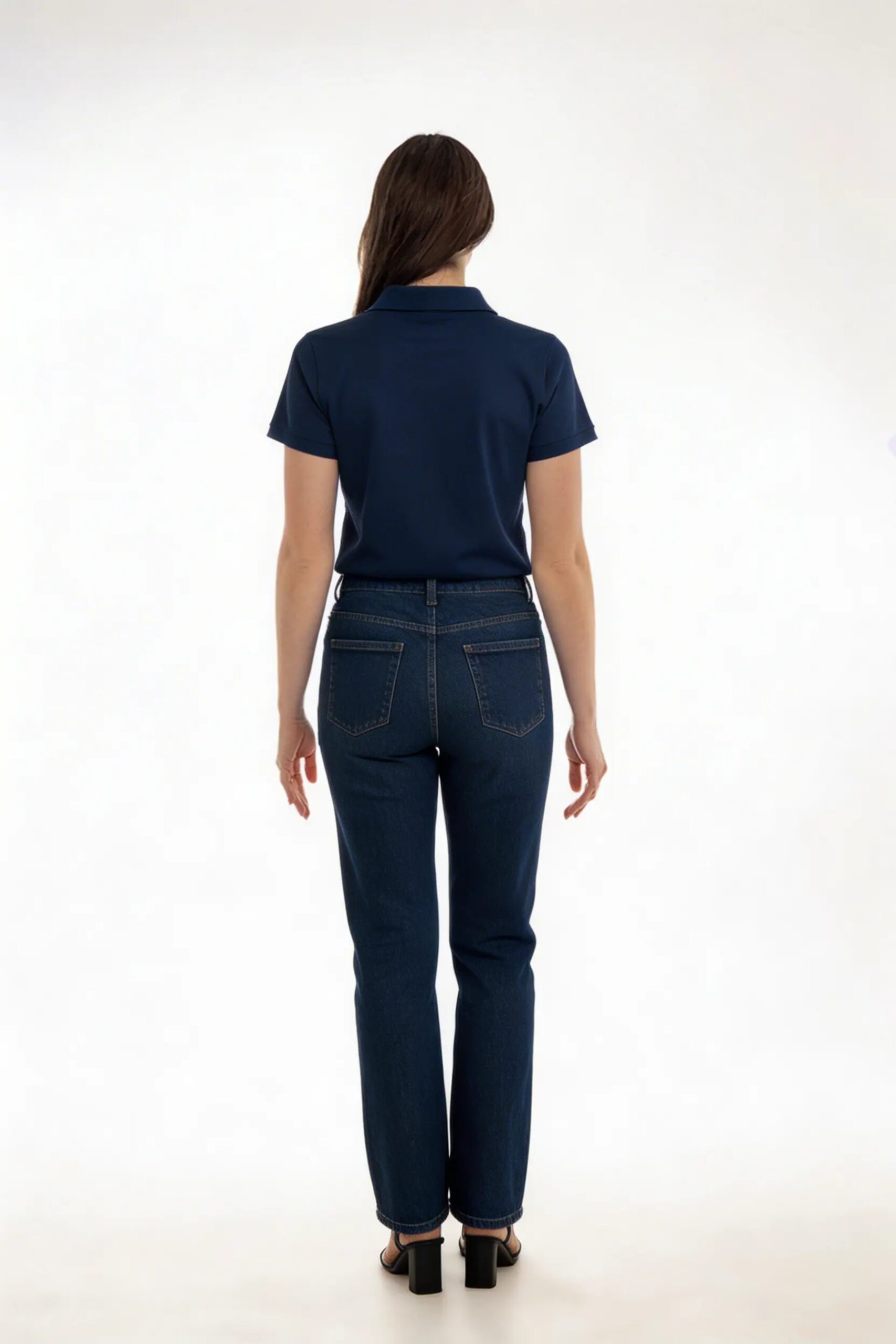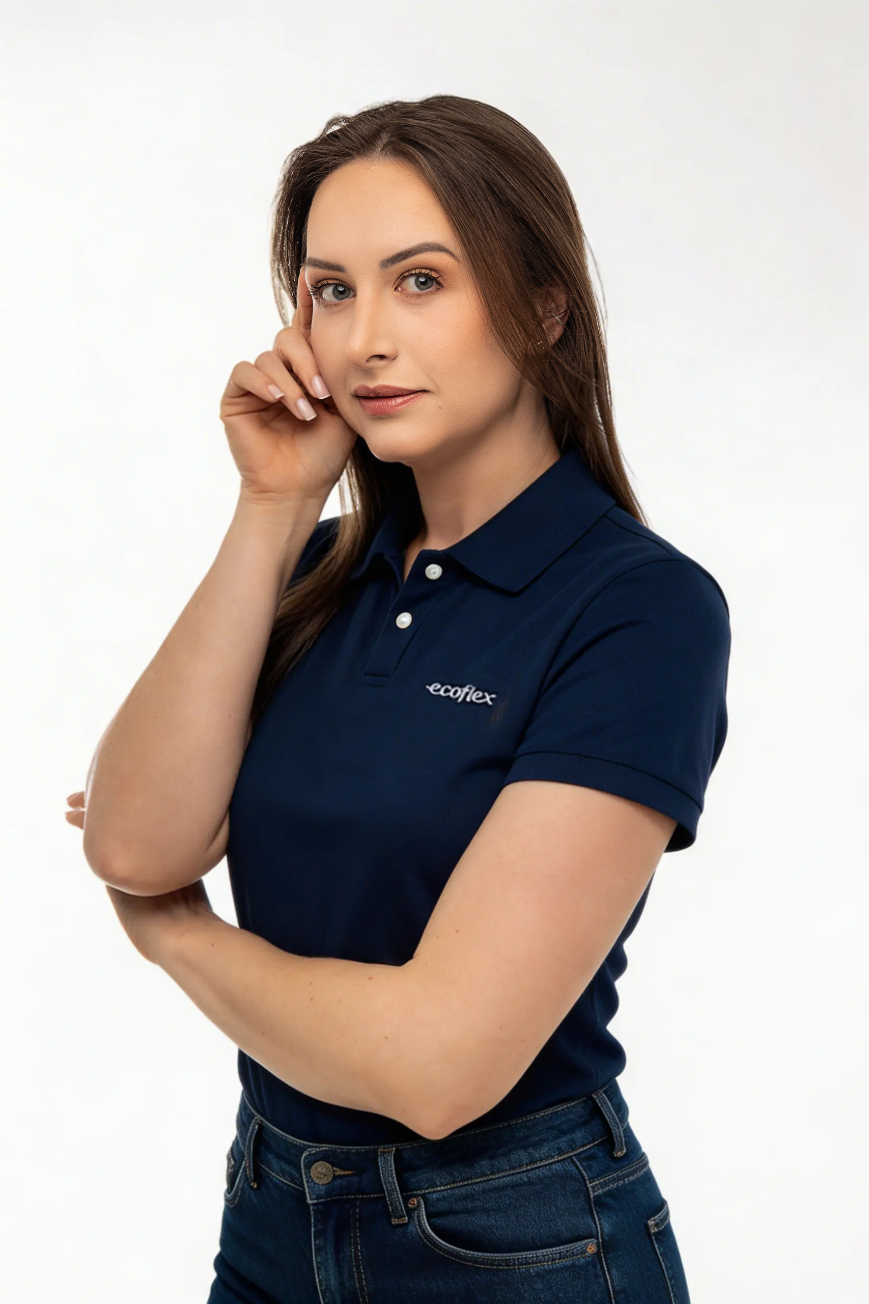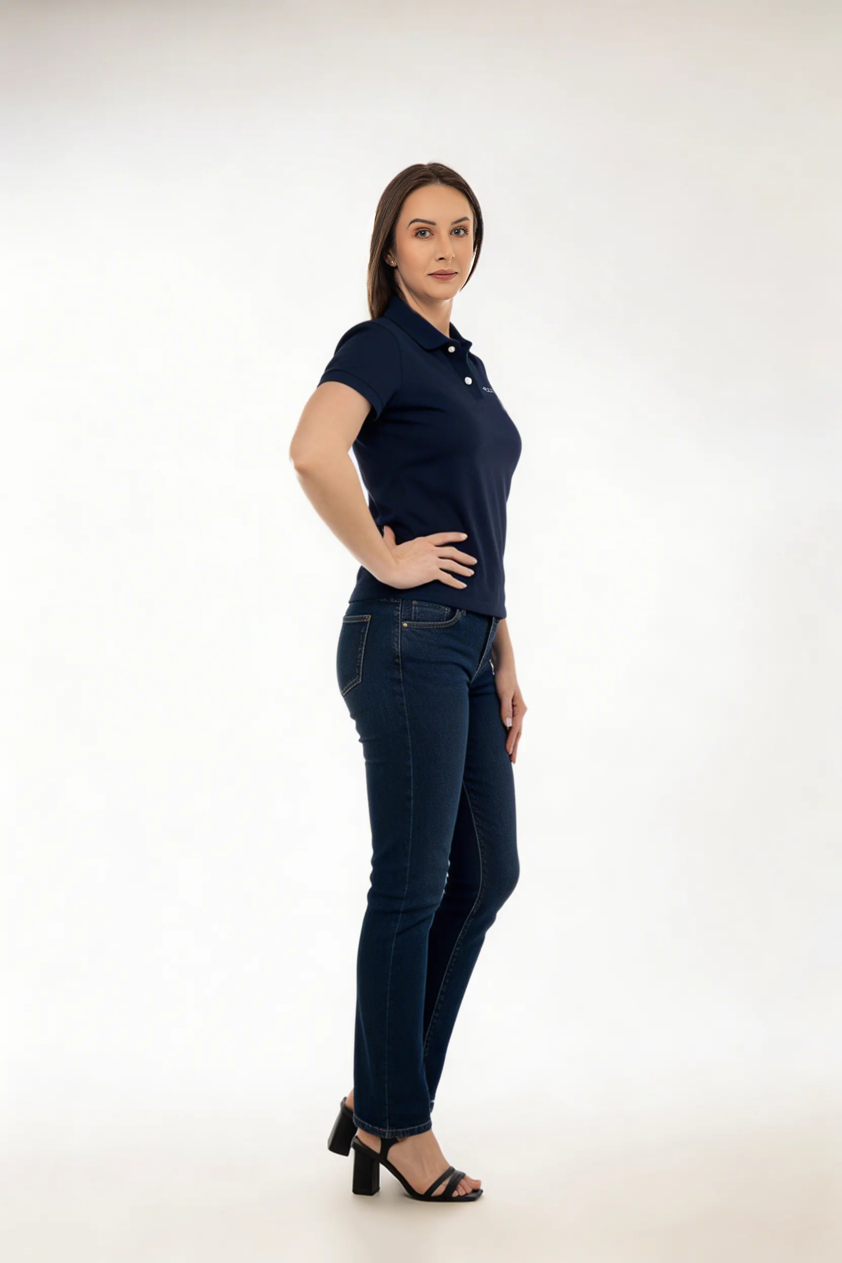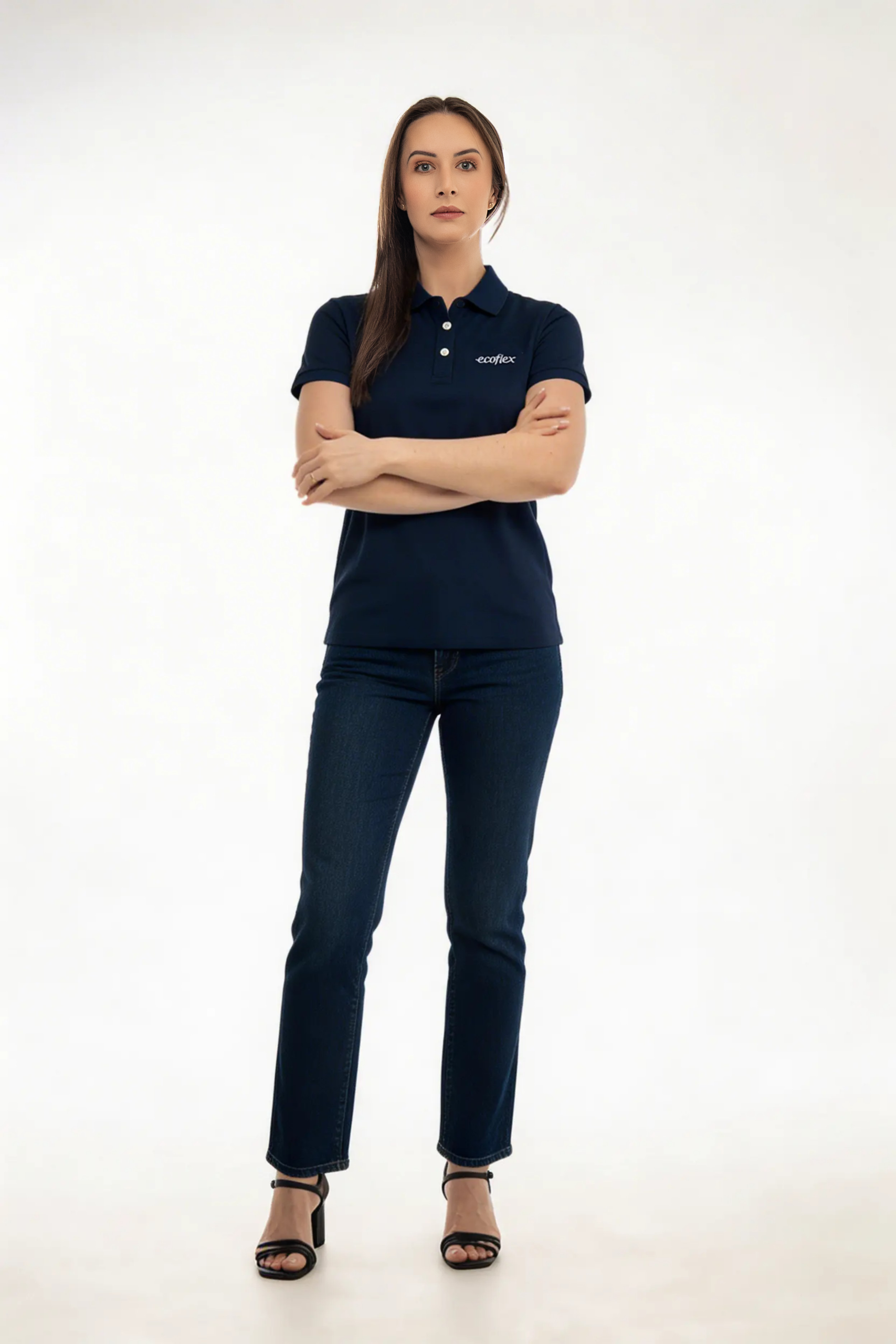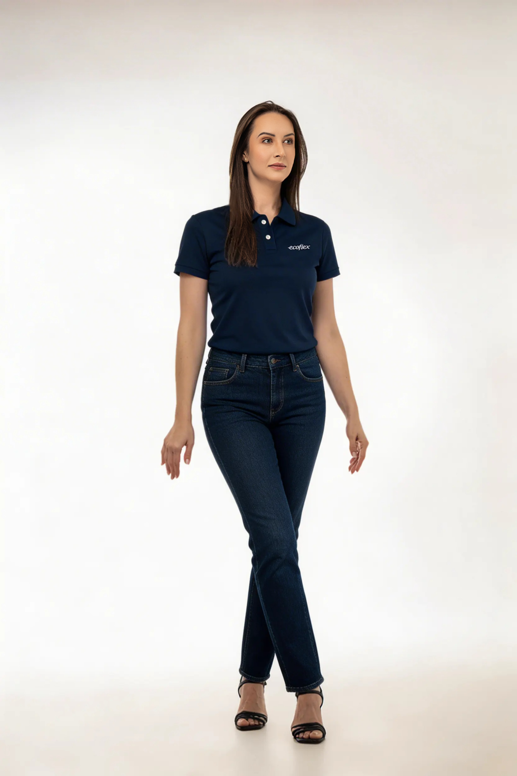 Manga curta, com decote delicado e pences que valorizam a silhueta. Bordado exclusivo Ecoflex na frente esquerda, reforçando a identidade da marca.