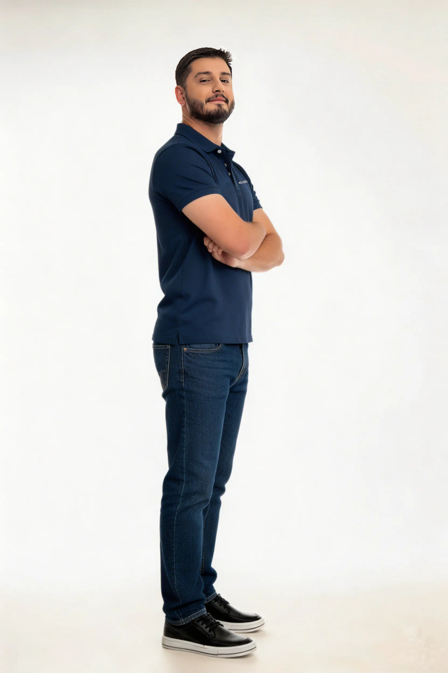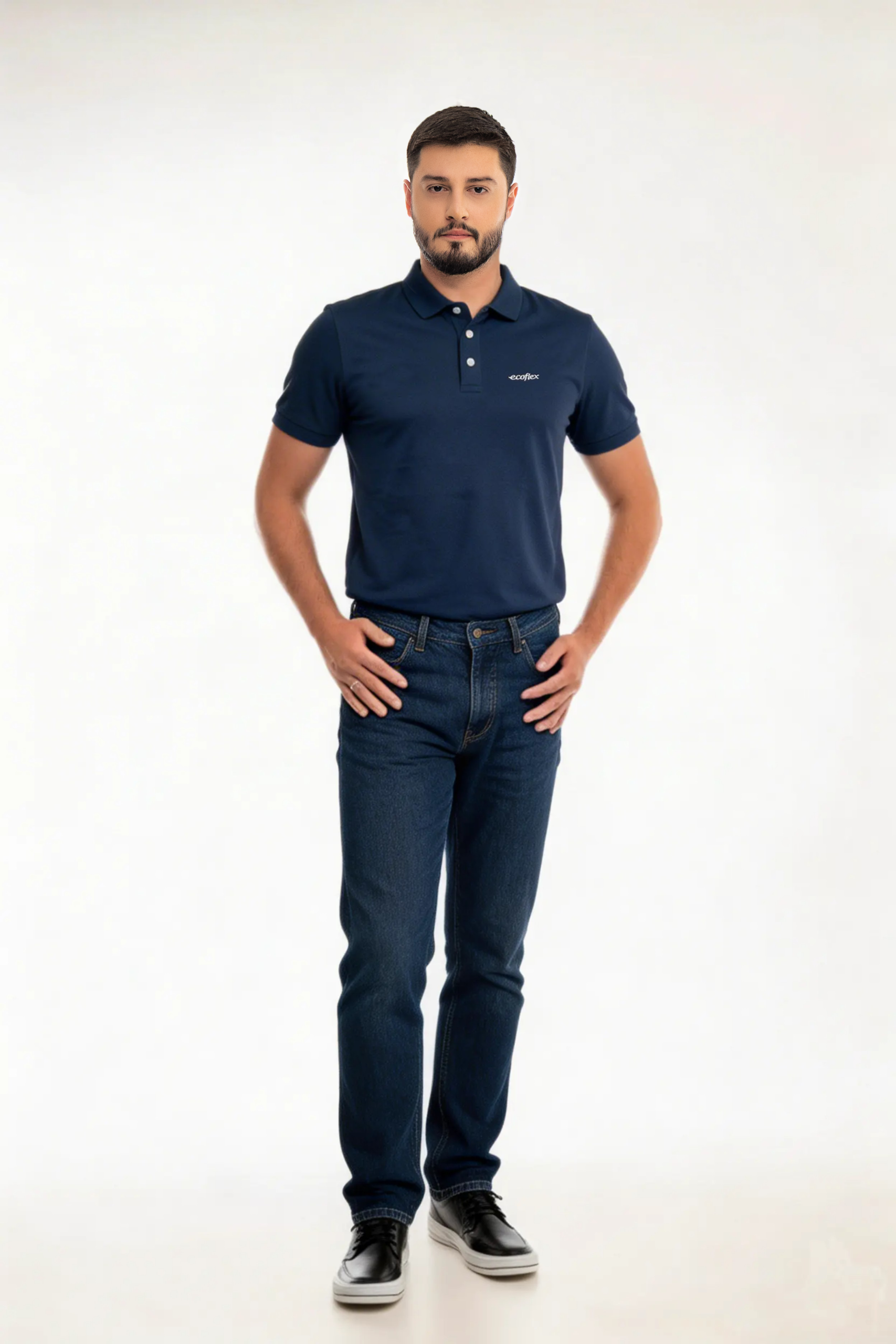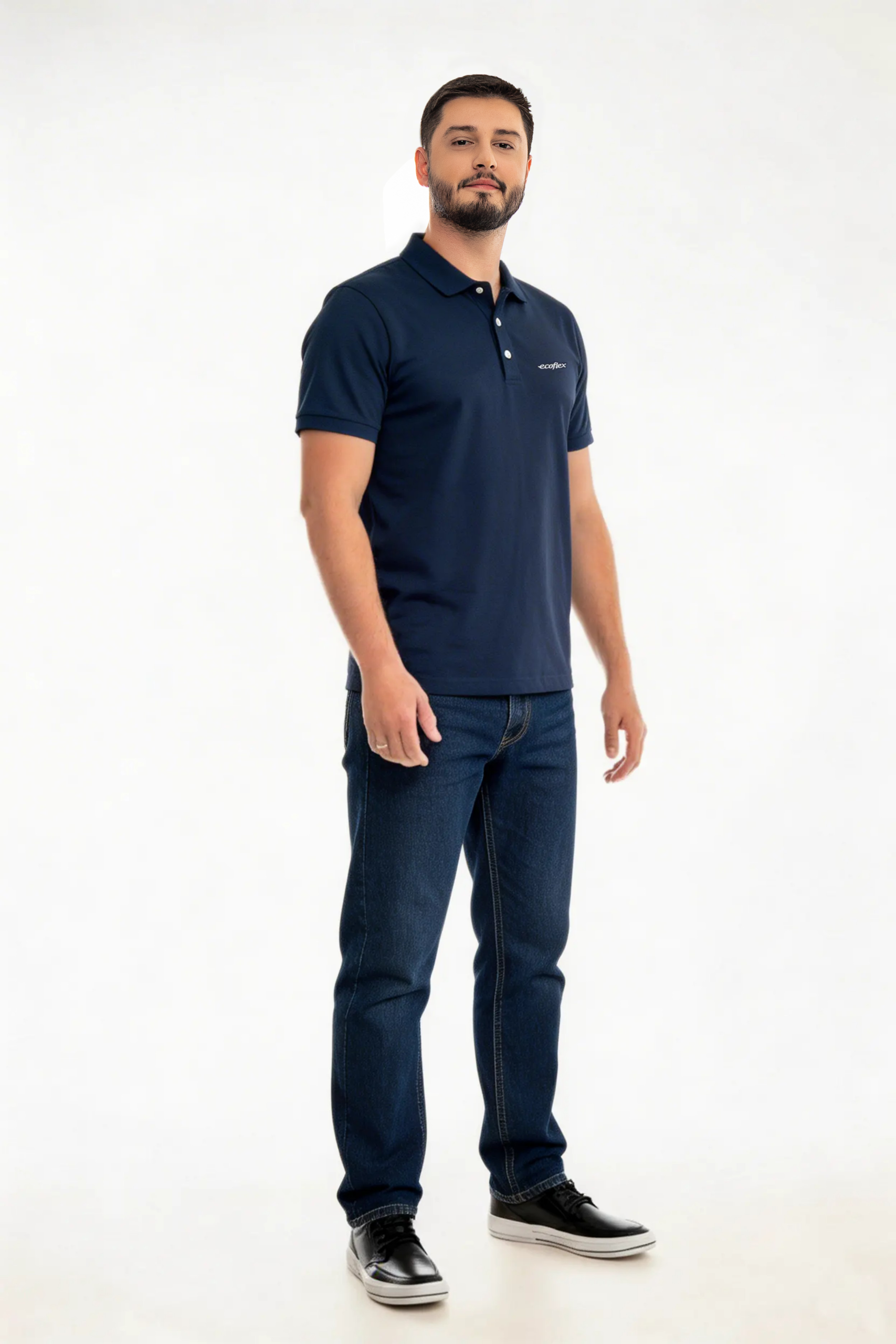 Mangas curtas com punho retilíneo, fechamento por peitilho com botões. Bordado exclusivo Ecoflex na frente esquerda, reforçando a identidade da marca.